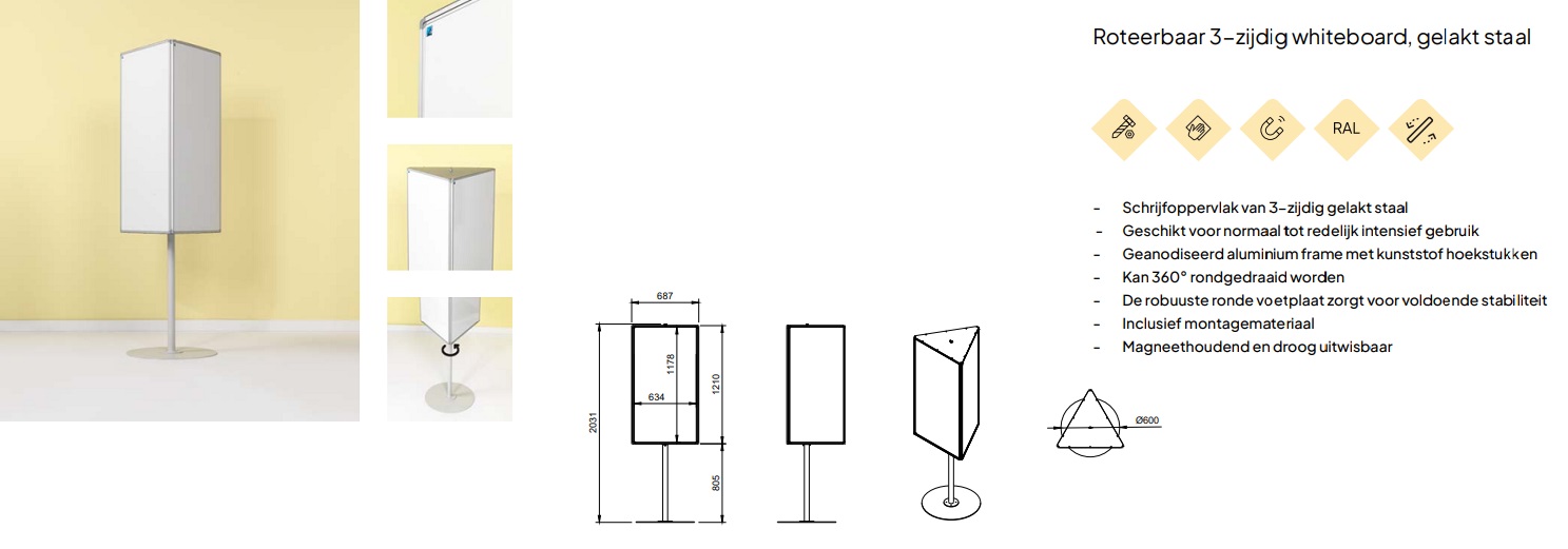 Roteerbaar 3-zijdig whiteboard, gelakt staal. Schrijfoppervlak van 3-zijdig gelakt staaL. Geschikt voor normaal tot redelijk intensief gebruik. Geanodiseerd aluminium frame met kunststof hoekstukken. Kan 360° rondgedraaid worden. De robuuste ronde voetplaat zorgt voor voldoende stabiliteit. Inclusief montagemateriaal. Magneethoudend en droog uitwisbaar. Zie voor afmetingen de afbeeldingen.| Aantal | Prijs per stuk |
