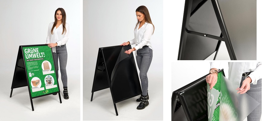 Stabiele budget indoor A-bord c.q. sandwichbord in volledig zwart met dubbelzijdig wissellijstprofiel 25 mm, met verstekhoeken, staanders en lijst van geanodiseerd aluminium, slagvaste polystyrol achterwand met antireflectie voorzetsheets. Levering met poster(s) op aanvraag.| Aantal | Prijs per stuk |