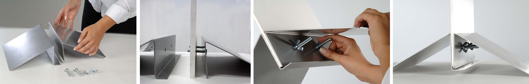 Stalen zilverkleurige bordhouder. Het systeem bestaat uit 2 elementen die men tegen elkaar aanschroeft om het bord te fixeren. Het bord dat men er tussen kan plaatsen kan tussen de 5 en 10 mm dik zijn. Aanbevolen voor borden die niet hoger zijn dan 150 cm. Exclusief bord.| Aantal | Prijs per stuk |