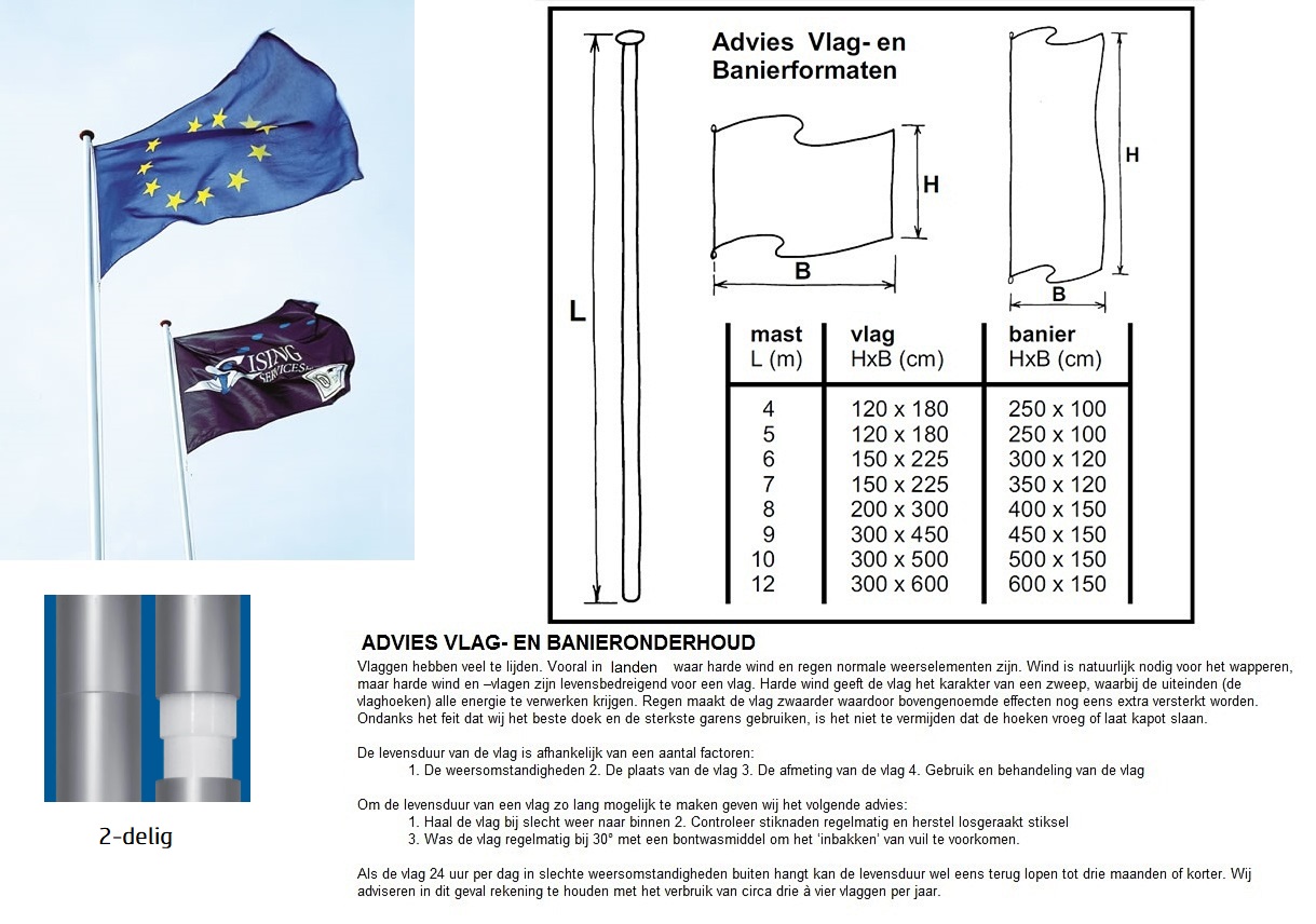 Witte of aluminium kleurige 2-delige cilindrische aluminium mast met diameter van 60 mm. Wordt geleverd inclusief oranje of zwarte knop (opgeven bij bestelling), koordgeleiding, kikker met koord en een grondbuis waar de mast in geplaatst wordt. De deelbare mast is geschikt voor permanente opstelling en intensief gebruik. Bij tijdelijke opstelling heeft de mast als voordeel dat deze weinig transport en opslagruimte in beslag neemt. De mast is eenvoudi in elkaar te schuiven en weer uit elkaar te schuiven. Grondbuis is standaard 80 cm diep. Hierdoor verliest u ook 80 cm mastlengte! Wanddikte van de mast is 3mm waardoor deze tot de meest kwalitatieve gerekend kan worden. Natuurlijk ook verkrijgbaar zonder grondbuis of i.p.v. een grondbuis met een overschuifkoker of kantelanker. De 2-delige mast is ook verkrijgbaar als baniermast en ook voor alle cilindrische masten tot en mat 9 m. Zie voor plaatsingsinstructie, info over mastopties en vlagafmetingen de bijgevoegde PDF. Voor transport naar de waddeneilanden en naar Belgie gelden andere transportkosten dan standaard aangegeven. Deze dient u op te vragen.| Aantal | Prijs per stuk |